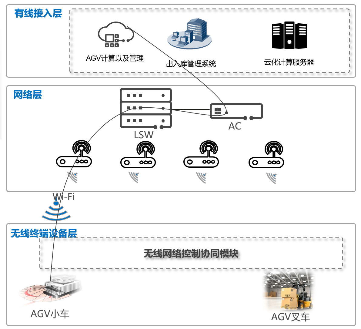 對于以上提到的揀選、分揀場景,都需要通過WLAN網絡實現AGV小車位置、狀態信息上報,和任務、運行控制指令的下發。WLAN網絡需要保障運行控制信息實時、可靠、正確傳遞給目標設備。