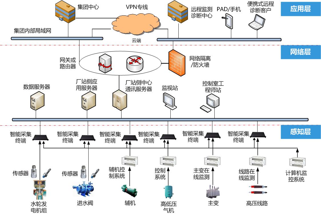 本解決方案包含在電站各發(fā)電設(shè)備上部署傳感器、采集處理設(shè)備,在電站部署數(shù)據(jù)挖掘、數(shù)據(jù)治理軟件,以及在發(fā)電集團(tuán)公司的工業(yè)云平臺(tái)(私有云)上部署監(jiān)測(cè)、預(yù)警、故障診斷等各類應(yīng)用。對(duì)應(yīng)于工業(yè)互聯(lián)網(wǎng)網(wǎng)絡(luò)體系架構(gòu),涉及以下多個(gè)位置: