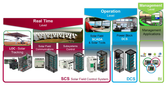本解決方案適用于槽式、塔式、菲涅爾式光熱發電廠。提供了從太陽島鏡場控制、儲換熱控制、發電島控制、全廠運行優化控制、仿真模擬系統以及在塔式類型電廠里的校準控制等等。