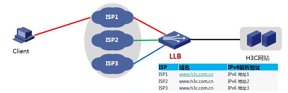 如圖6顯示,部分網(wǎng)站出口會(huì)連接多家ISP線(xiàn)路。此種多ISP出口場(chǎng)景下,可使用鏈路負(fù)載均衡—Inbound LLB解決DNS解析問(wèn)題。