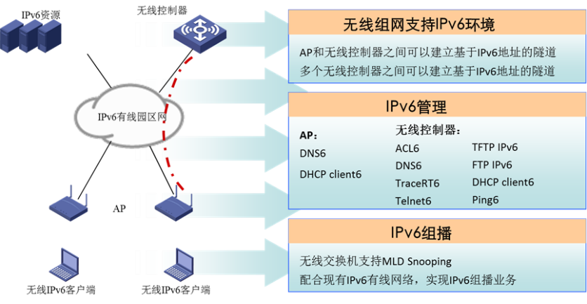 ? 支持ACL6、DNS6、Tracert6、Telnet6、TFTP IPv6、FTP IPv6、DHCP client6、Ping6實(shí)現(xiàn)IPv6有線(xiàn)無(wú)線(xiàn)網(wǎng)的同等管理。