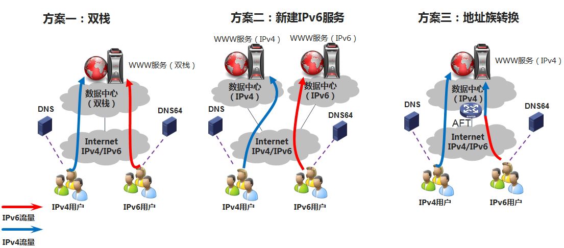 3)地址族轉(zhuǎn)換:在IPv4網(wǎng)站外部,掛接一臺(tái)v4/v6地址族轉(zhuǎn)換設(shè)備,原有IPv4源站不需修改,把DNS域名解析AAAA記錄指向轉(zhuǎn)換設(shè)備配置的IPv6 地址;IPv6用戶(hù)訪(fǎng)問(wèn)目標(biāo)網(wǎng)站,經(jīng)DNS解析調(diào)度后轉(zhuǎn)向訪(fǎng)問(wèn)轉(zhuǎn)換設(shè)備的IPv6 地址,轉(zhuǎn)換設(shè)備從IPv4 源站讀取數(shù)據(jù),經(jīng)過(guò)協(xié)議轉(zhuǎn)換后發(fā)送數(shù)據(jù)給IPv6用戶(hù)。