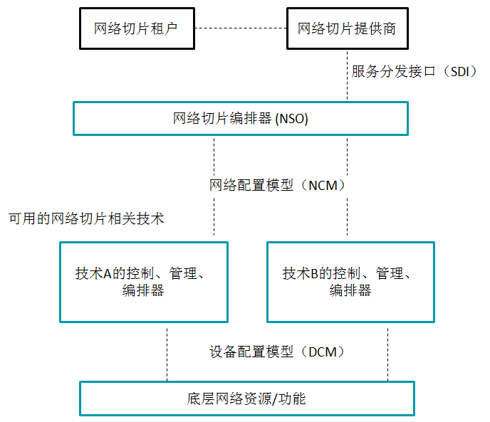 用戶NST通過服務(wù)模型來請求NSaaS,該服務(wù)模型用用戶的語言來描述切片,通常為業(yè)務(wù)體驗類的語言。切片提供者(運營商)將用戶需求翻譯給服務(wù)傳遞模型,這個模型可以用來描述運營商怎么使用自己的資源來提供支持業(yè)務(wù)。該傳遞業(yè)務(wù)模型會被發(fā)送到網(wǎng)絡(luò)切片的編排器(NSO),并且和不同的技術(shù)來映射,進一步分解到網(wǎng)絡(luò)配置模型中。最終在網(wǎng)絡(luò)配置模型(NCM)中建立起相對應的底層設(shè)施和功能的參數(shù),從而調(diào)用相應的底層資源建立起相應切片的服務(wù)。