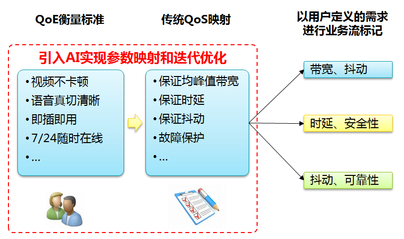 網(wǎng)絡(luò)切片實施的關(guān)鍵步驟是將用戶的實際需求映射為傳統(tǒng)網(wǎng)絡(luò)質(zhì)量需求,例如將流暢清晰地播放視頻和語音,實現(xiàn)網(wǎng)絡(luò)設(shè)備的即插即用以及保障7天24小時隨時在線等需求,映射為網(wǎng)絡(luò)的平均峰值帶寬、時延、抖動以及故障保護等指標,從而使網(wǎng)絡(luò)切片提供商提供相應專用、隔離、服務(wù)可保證的網(wǎng)絡(luò)切片。并且,可以引入AI技術(shù)實現(xiàn)參數(shù)映射和迭代優(yōu)化,更好的滿足用戶需求。