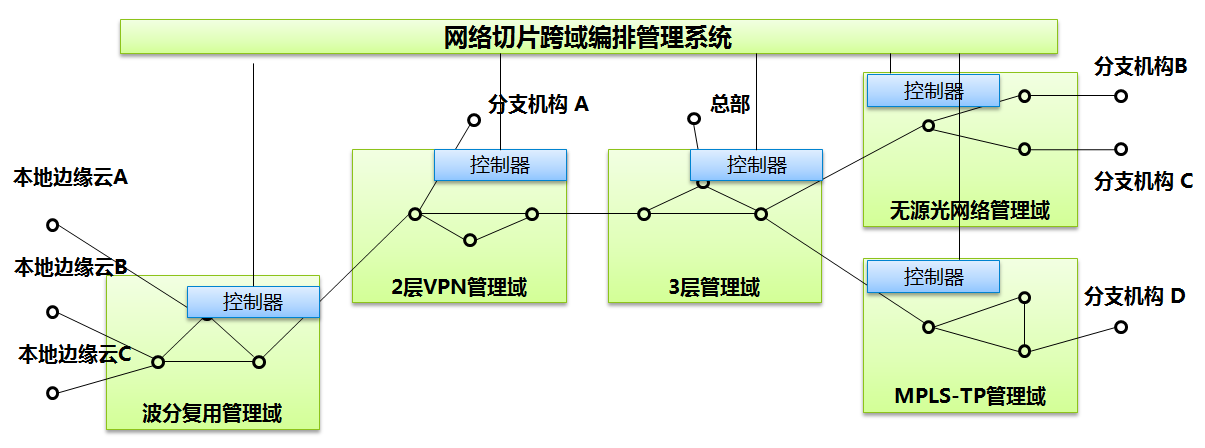 跨管理域編排實現(xiàn)端到端的網(wǎng)絡(luò)切片管理,滿足不同網(wǎng)絡(luò)拓撲、性能與功能的需求。網(wǎng)絡(luò)數(shù)據(jù)的傳輸過程中,不同的業(yè)務(wù)會由不同的方式或不同的網(wǎng)絡(luò)協(xié)議進行承載轉(zhuǎn)發(fā)。例如,分支機構(gòu)向總部的業(yè)務(wù)請求,可能會經(jīng)過2層VPN到3層路由等協(xié)議,分支機構(gòu)向云發(fā)送業(yè)務(wù)請求,可能會經(jīng)過無源光網(wǎng)絡(luò)到波分復用的轉(zhuǎn)換等。網(wǎng)絡(luò)切片需實現(xiàn)網(wǎng)絡(luò)各層級轉(zhuǎn)換的無縫銜接,保障業(yè)務(wù)數(shù)據(jù)流端到端的可識別性,從而提供專屬的網(wǎng)絡(luò)切片來進行承載和轉(zhuǎn)發(fā)。