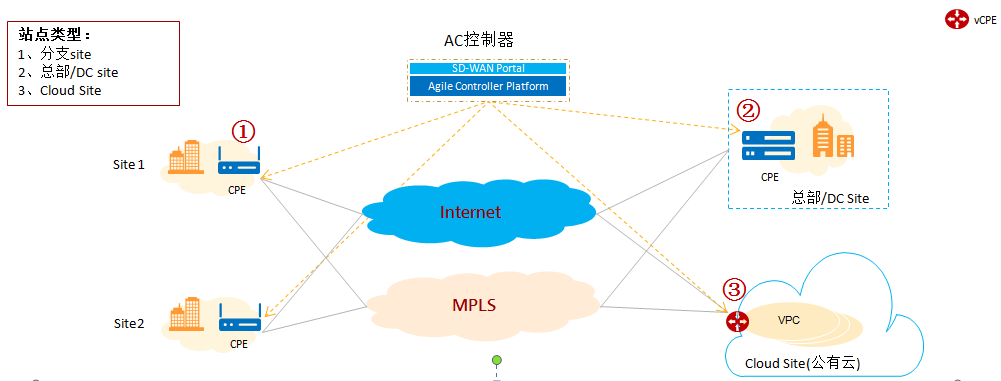 2) 常見的站點類型:企業分支、園區、DC、公有云VPC。