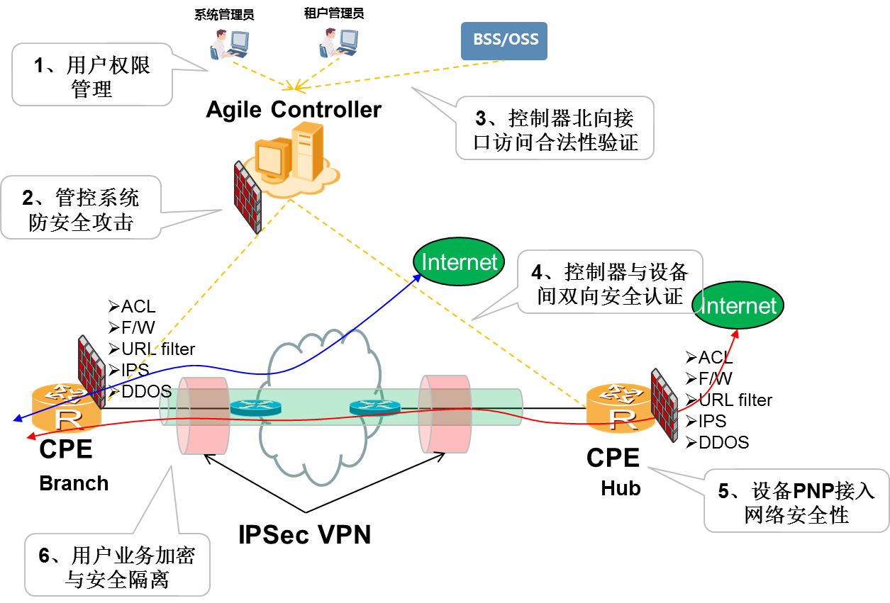 綜上所述,通過確保集中的管理控制系統(控制器)的安全性、用戶接入設備(CPE)的安全性、用戶業務隔離以及報文數據安全性以及用戶接入SD-WAN網絡的安全性,確保SD-WAN解決方案系統的機密性、完整性、可用性和可追溯性,從而保證整個SD-WAN解決方案業務的安全和正常運轉。