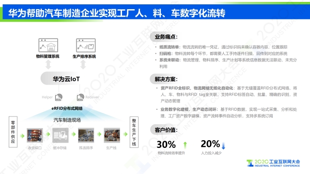 點(diǎn)擊下方鏈接,觀看演講視頻 專家說 “全要素連接,多域數(shù)據(jù)協(xié)同,是制造數(shù)字化轉(zhuǎn)型的基礎(chǔ)。華為云IoT工業(yè)互聯(lián)網(wǎng)解決方案提供生產(chǎn)要素的全連接,一站式的工業(yè)數(shù)據(jù)的治理和孿生分析,幫助制造業(yè)企業(yè)實(shí)現(xiàn)了生產(chǎn)現(xiàn)場制造KPF的優(yōu)化,質(zhì)量的全流程追溯和管控。我們提供創(chuàng)新的5G的RFID服務(wù),實(shí)現(xiàn)了倉儲(chǔ)的數(shù)字化、物料全程自動(dòng)化跟蹤、商場計(jì)劃、物流管理、供應(yīng)管理需求動(dòng)態(tài)協(xié)同,提升物料的流轉(zhuǎn)效率30%。當(dāng)前,制造業(yè)數(shù)字化轉(zhuǎn)型正當(dāng)時(shí),華為愿與產(chǎn)業(yè)鏈上下游伙伴們攜手供應(yīng),共同構(gòu)建工業(yè)互聯(lián)網(wǎng)的黑土地。” 以下是演講PPT 敬請(qǐng)閱讀