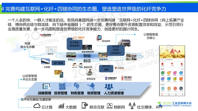 “在5G的加持下,新鳳鳴構建了集成基礎數據、實時數據、ERP、MES、大數據及商務智能、APP和標識解析于一體的工業互聯網平臺,形成智能+辦公、智能+物流、智能+銷售、智能+決策、智能+生產、智能+運營的十大應用,一體化打通集團的業務鏈、數據鏈和決策鏈,實現與內外部的互聯互通,支撐企業向上拓展產業鏈,橫向打通供應與物流鏈,向下延伸金融與服務鏈,用平臺的先進性支撐和保持我們企業高速發展、創新發展、高質量發展。”