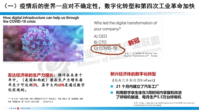 “工業(yè)互聯(lián)網(wǎng)是數(shù)字化轉(zhuǎn)型的路徑和方法論,是數(shù)據(jù)驅(qū)動、工業(yè)機(jī)理與智能科學(xué)結(jié)合、數(shù)字空間與物理世界融合的智能化決策閉環(huán)”,余曉暉在演講表明,當(dāng)前對于新冠疫情蔓延,還有新冠疫情以后以及當(dāng)前全球化發(fā)展態(tài)勢,供應(yīng)鏈多樣化,整個產(chǎn)業(yè)國際分工變化,其實(shí)有很多不確定性,但是有一點(diǎn)比較確定的是,在新冠疫情后,整個全球數(shù)字化轉(zhuǎn)型和第四次工業(yè)革命將進(jìn)一步加快。