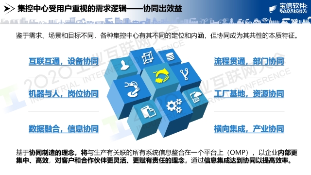 “目前的集控中心建設(shè)有很多成功的實踐,有些已經(jīng)落地,并為企業(yè)的運營帶來了諸多的方便,有些還在不斷的探索中。集控中心的內(nèi)涵將隨著越來越多成功實踐的落地而不斷的清晰化,其內(nèi)涵、規(guī)模、邊界和形式在探索中不斷的清晰和固定下來,顯然協(xié)同增效將成為集控中心的價值取向。未來我們追求的集控中心不僅有中心的大屏,更多的是追求移動式的集控中心的建設(shè),也就是說移動式的手持終端將在集控中心中起到更重要的作用,集控中心將成為智能制造的一個重要的模式。”