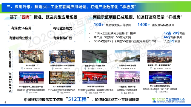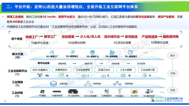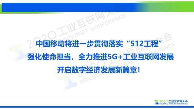 “工業(yè)互聯(lián)網(wǎng)是5G應(yīng)用范圍最廣、解決方案最成熟、價值提升最顯著的領(lǐng)域之一。5G不僅是運營商的5G,更是千行百業(yè)的5G。在推進‘5G+工業(yè)互聯(lián)網(wǎng)’創(chuàng)新發(fā)展的實踐中,中國移動緊抓新基建帶來的空前機遇,已通過5G垂直行業(yè)布局,初步形成了示范效應(yīng),并努力實施‘五個升級’策略,即加快網(wǎng)絡(luò)升級、平臺升級、應(yīng)用升級、模式升級和生態(tài)升級,推動‘5G+工業(yè)互聯(lián)網(wǎng)’加速發(fā)展。未來,中國移動將繼續(xù)深化貫徹落實‘512工程’,強化使命擔(dān)當,攜手各界合作伙伴,全力推進‘5G+工業(yè)互聯(lián)網(wǎng)’發(fā)展。”