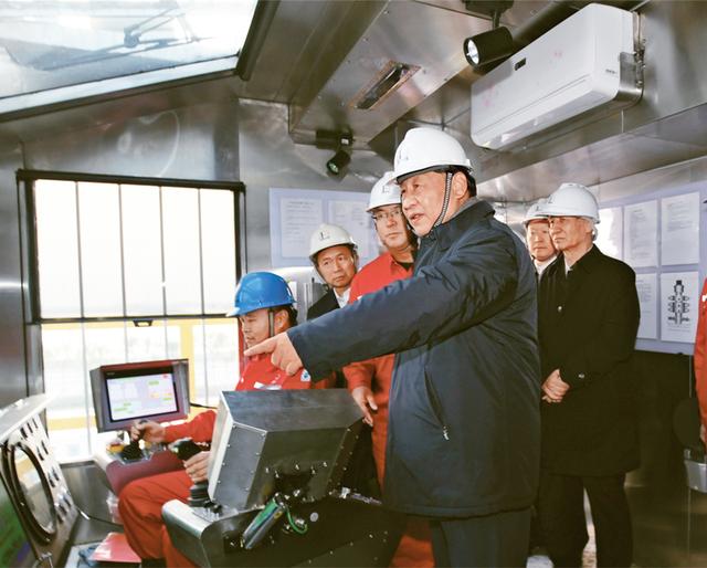 2021年10月22日下午,中共中央總書記、國家主席、中央軍委主席習近平在山東省濟南市主持召開深入推動黃河流域生態保護和高質量發展座談會并發表重要講話。這是座談會前,習近平21日下午在位于東營市萊州灣的勝利油田萊113區塊考察時,登上二層鉆井平臺,察看鉆井自動化設備。 新華社記者 李學仁/攝