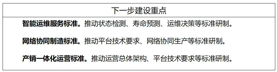 大規模個性化定制標準主要包括通用要求、需求交互要求、設計要求、生產要求等標準;智能運維服務標準主要包括通用要求、數據接口、狀態監測、故障診斷、壽命預測、運維決策等標準;網絡協同制造標準主要包括平臺技術要求、資源模型要求、協同經營管理、網絡協同設計、網絡協同生產等標準;產銷一體化運營主要包括運營總體架構、平臺技術要求、數據分類規范等標準;其他主要包括上述四類以外的智能制造新模式的通用要求和服務交付等標準。