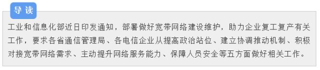 為認真貫徹落實習近平總書記關于新冠肺炎疫情防控工作重要指示精神和黨中央、國務院決策部署,有序推進疫情防控和企業(yè)復工復產(chǎn),現(xiàn)就做好寬帶網(wǎng)絡建設維護,助力企業(yè)復工復產(chǎn)有關工作通知如下:
