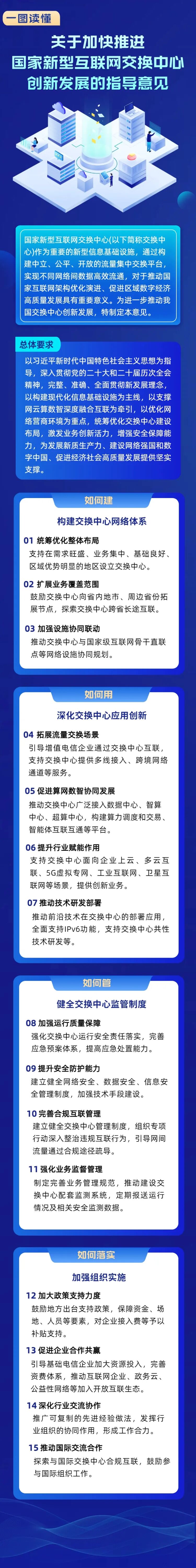 《指導意見》明確以習近平新時代中國特色社會主義思想為指導,貫徹新發(fā)展理念,以構建現(xiàn)代化信息基礎設施為主線,以支撐網(wǎng)云算數(shù)智深度融合互聯(lián)為牽引,以優(yōu)化網(wǎng)絡營商環(huán)境為重點,統(tǒng)籌優(yōu)化交換中心建設布局,激發(fā)業(yè)務創(chuàng)新活力,增強安全保障能力,為經(jīng)濟社會高質量發(fā)展提供堅實支撐。
