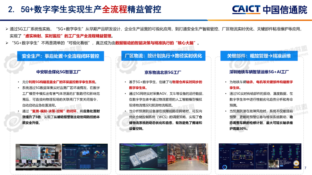 報告分析,1260個5G工廠名錄項目已覆蓋全國28個省(自治區、直轄市)、9個國民經濟門類、60個國民經濟大類。同時5G工廠作為推進工業和信息化深度融合的重要舉措,原材料工業、裝備工業、消費品工業、電子信息、能源交通等行業企業與基礎電信企業、設備及行業服務商深度合作,形成100個5G工廠典型應用實踐,各工廠平均5G網絡覆蓋率高達99.3%、現場裝備聯網率高達97.7%、無線設備5G聯網率達97%,“5G+工業互聯網”應用場景建設數量達10.5個,5G在工廠內由“單點”應用向全環節、全流程、全周期、全局、自主協同等“綜合”應用發展。一是加速企業全環節柔性生產。5G工廠推動工廠網絡無線化,通過5G全廠覆蓋,探索實現生產現場裝備云化群體控制、產線模塊化快速重構、供應鏈實時動態協同等,從而支撐企業依據市場需求,實現全環節快速調整的柔性生產方式。二是5G+數字孿生實現生產全流程精益管控。通過5G工廠系統性實施, “5G+數字孿生”已從產品研發設計、企業生產運營的可視化應用,擴展到安全生產閉環管控、廠區物流實時優化、關鍵部件精準運維等應用,實現了“虛實映射、實時監控”的工廠生產全流程精益管理。三是5G+大數據賦能企業全生命周期能碳精準管理。企業通過5G工廠建設,充分利用5G實現全廠區、全流程能源消耗與關鍵排放源數據的實時采集,構建包含碳排放監測、碳足跡核算、全鏈條碳管理等功能的能效管理體系,形成基于數據驅動的能碳精準管控模式。四是5G+AI助力實現生產全局智能發展。在5G工廠智能化服務應用要求的牽引下,工廠充分利用5G實時采集匯聚全廠及供應商相關數據,推動人工智能應用從單點輔助工具,深入到產品研發、產線生產、系統運維、企業管理等全局,形成生產供應鏈智能全局調度,產品運維智能服務等新模式。五是5G+AI融合形成多機自主協同操控。隨著5G工廠建設質量的不斷提升,5G高可靠、低時延性能不斷增強,人工智能技術的應用開發,設備遠程操控將從早期依賴人工判斷和操作的單點遠程操控,向由數據驅動的多設備自感知、自適應、自決策的智能化無人自主協同操控演進。
