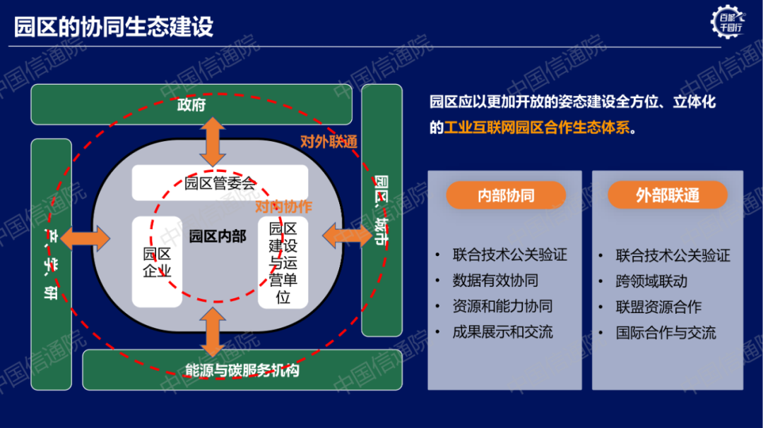 工業互聯網園區整體框架:工業互聯網園區的建設與發展,應在國家和各級地方政府政策措施的引領下,以科學規劃為指導,通過打造網絡、標識、平臺、安全等園區數字底座,構建園區內部與外部的數據流動閉環,形成各產業角色之間的協同有機生態。建設數字化轉型促進中心等載體,以標準、評價、金融等體系為保障,通過新技術、新模式、新場景、新業態的應用,形成園區的健康、低碳、良性、區域一體化發展的新發展模式,建立園區發展特色和發展優勢。