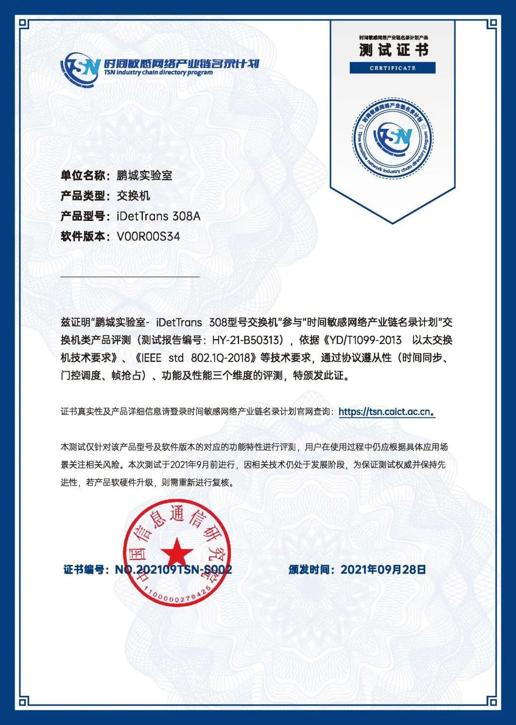 2021年9月,鵬城實(shí)驗(yàn)室研發(fā)的iDetTrans308A交換機(jī)順利通過 “TSN產(chǎn)業(yè)鏈名錄計(jì)劃”產(chǎn)品測試,獲得交換機(jī)類測試證書,成為第一批加入產(chǎn)業(yè)鏈名錄計(jì)劃的產(chǎn)品。