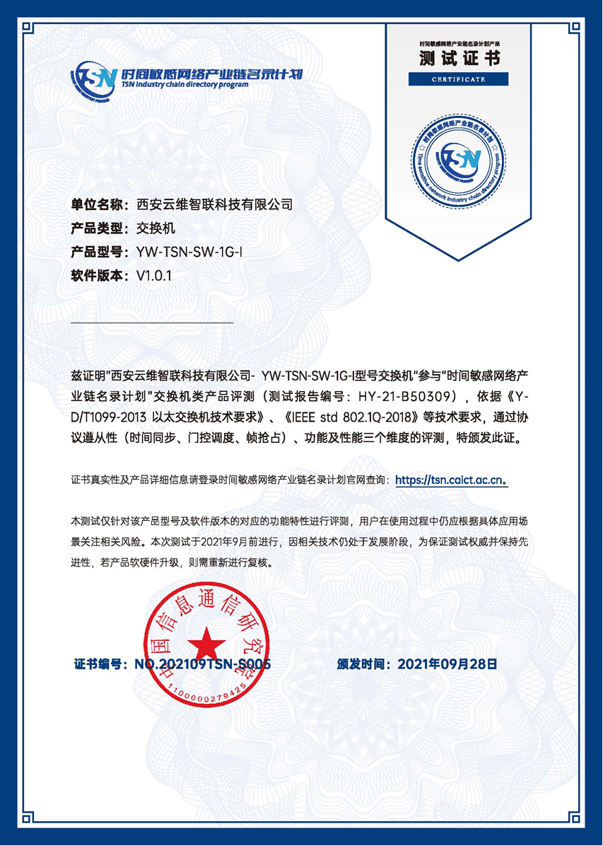 2021年9月,西安云維智聯科技有限公司研發的YW-TSN-SW-1G-I TSN交換機在互聯網與工業融合創新工信部重點實驗室順利通過“TSN產業鏈名錄計劃”產品測試,獲得交換機類測試證書,成為第一批加入產業鏈名錄計劃的產品。