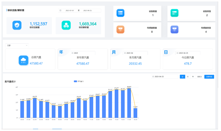 針對該園區(qū)蒸汽使用的情況,為每一臺蒸汽鍋爐安裝蒸汽流量傳感器和邊緣智傳網(wǎng)關(guān),在蒸汽使用的廠房入口的位置也同樣部署傳感器和網(wǎng)關(guān),結(jié)合自主開發(fā)的IoT能源監(jiān)測管理平臺,對軟硬件進行了快速的部署,實現(xiàn)了全園區(qū)蒸汽生產(chǎn)與使用的在線監(jiān)管,精準實現(xiàn)了蒸汽生產(chǎn)量、使用量、使用率、損失率、能源利用率等數(shù)據(jù)的統(tǒng)計。