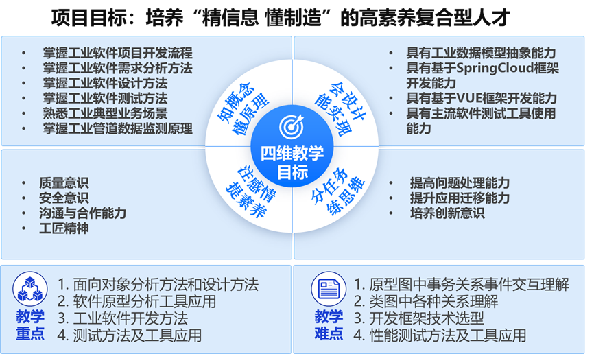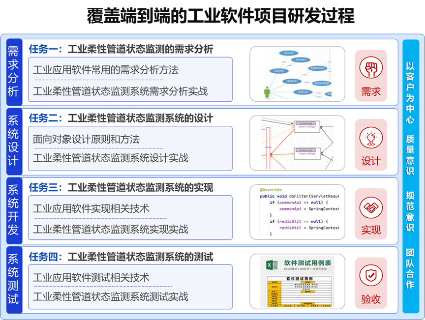 本實(shí)訓(xùn)主要讓學(xué)生通過(guò)一個(gè)工業(yè)互聯(lián)網(wǎng)APP的開(kāi)發(fā),實(shí)踐項(xiàng)目開(kāi)發(fā)的全過(guò)程。此實(shí)訓(xùn)的設(shè)計(jì)嚴(yán)格按照企業(yè)的項(xiàng)目開(kāi)發(fā)流程,讓學(xué)生全程參與,在掌握工業(yè)互聯(lián)網(wǎng)APP開(kāi)發(fā)技能的同時(shí),結(jié)合實(shí)際的應(yīng)用場(chǎng)景理解“人機(jī)料法環(huán)”等工業(yè)互聯(lián)網(wǎng)的核心要素,熟悉工業(yè)互聯(lián)網(wǎng)軟件工程的全過(guò)程。在實(shí)訓(xùn)過(guò)程中,學(xué)生不僅可以了解軟件項(xiàng)目過(guò)程中需要學(xué)習(xí)的知識(shí),需要設(shè)置的崗位角色以及各個(gè)崗位角色之間如何配合,更需要充分發(fā)揮學(xué)生的主觀能動(dòng)性,基礎(chǔ)好的帶動(dòng)基礎(chǔ)弱的,共同進(jìn)步,互相促進(jìn),體現(xiàn)團(tuán)隊(duì)的優(yōu)勢(shì),懂得團(tuán)隊(duì)合作能發(fā)揮最大效能。