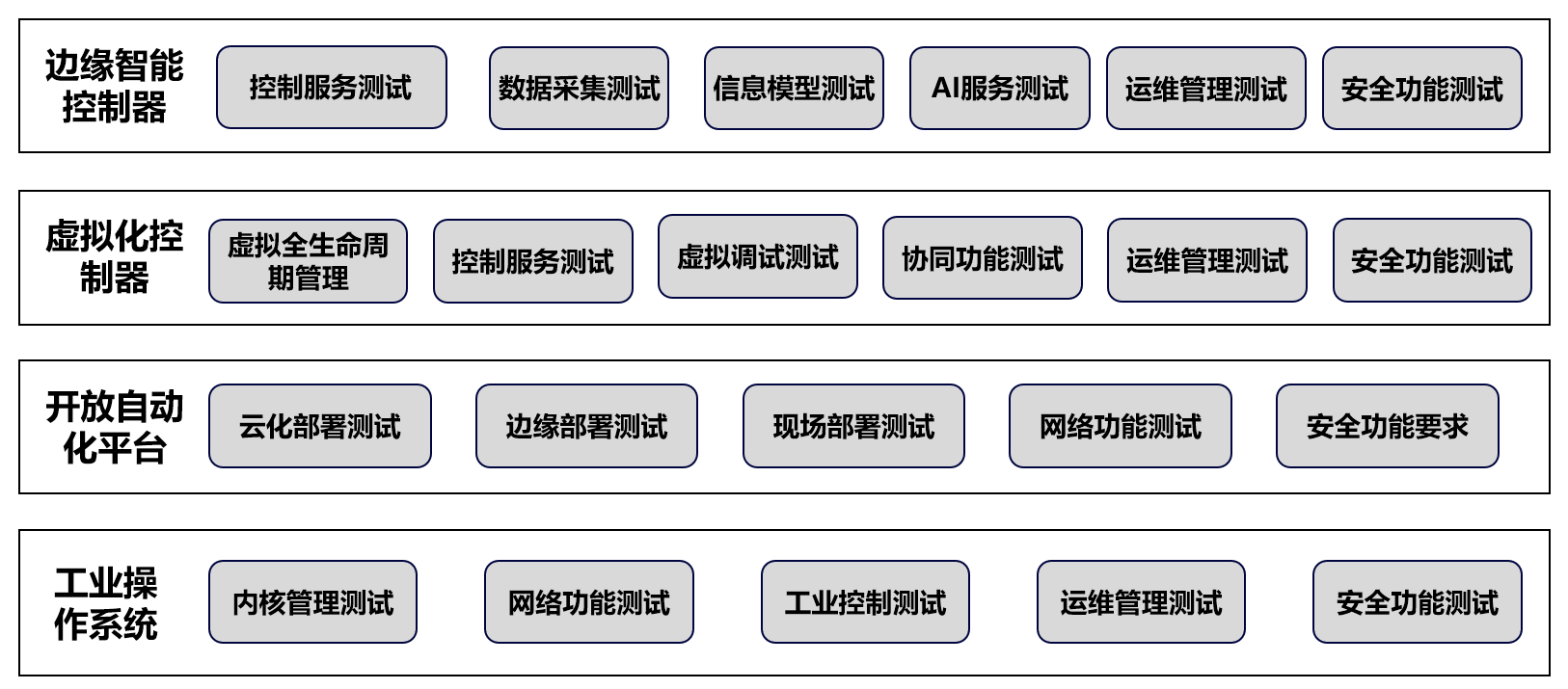 新型工業控制產品測試對象包括邊緣智能控制器、虛擬化控制器、開放自動化平臺、工業操作系統智能數采與監視系統。
