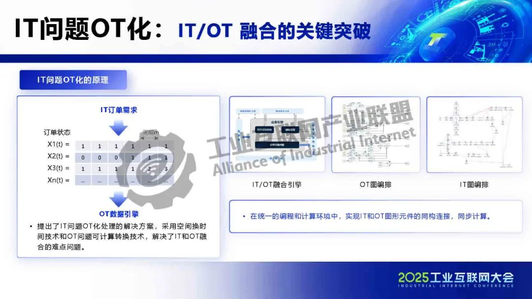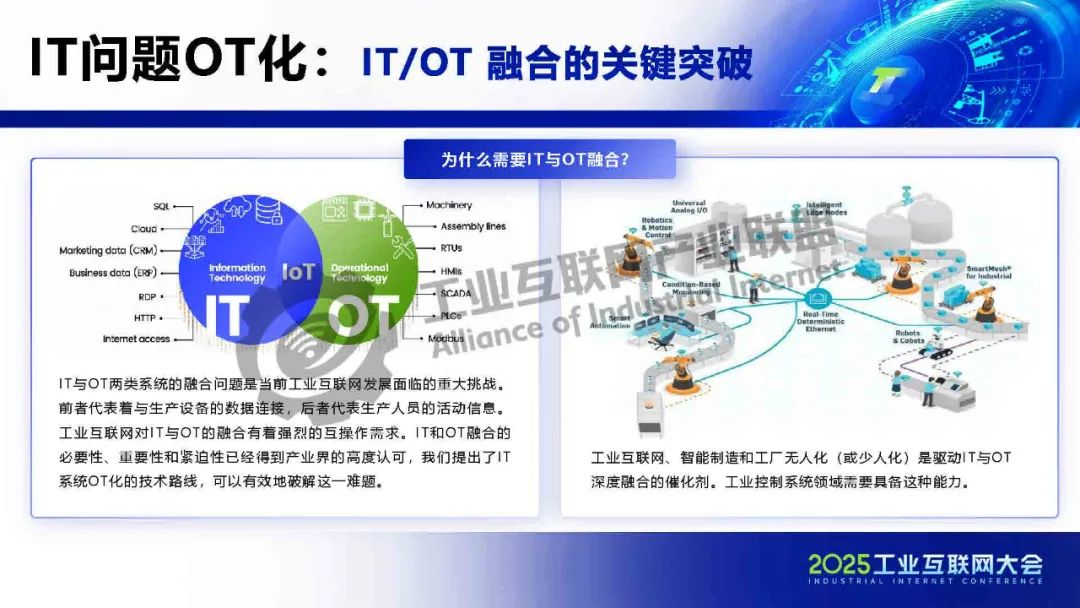 IT與OT兩類系統的融合問題是當前工業互聯網發展面臨的重大挑戰。前者代表著與生產設備的數據連接,后者代表生產人員的活動信息。工業互聯網對IT與OT的融合有著強烈的互操作需求。IT和OT融合的必要性、重要性和緊迫性已經得到產業界的高度認可,我們提出了IT系統OT化的技術路線,可以有效地破解這一難題。