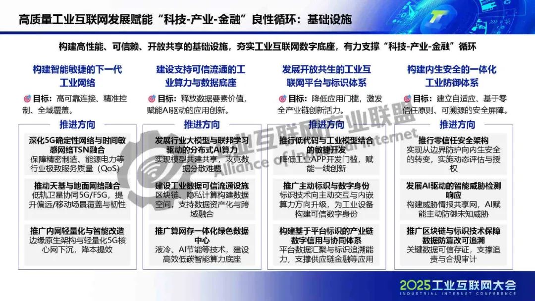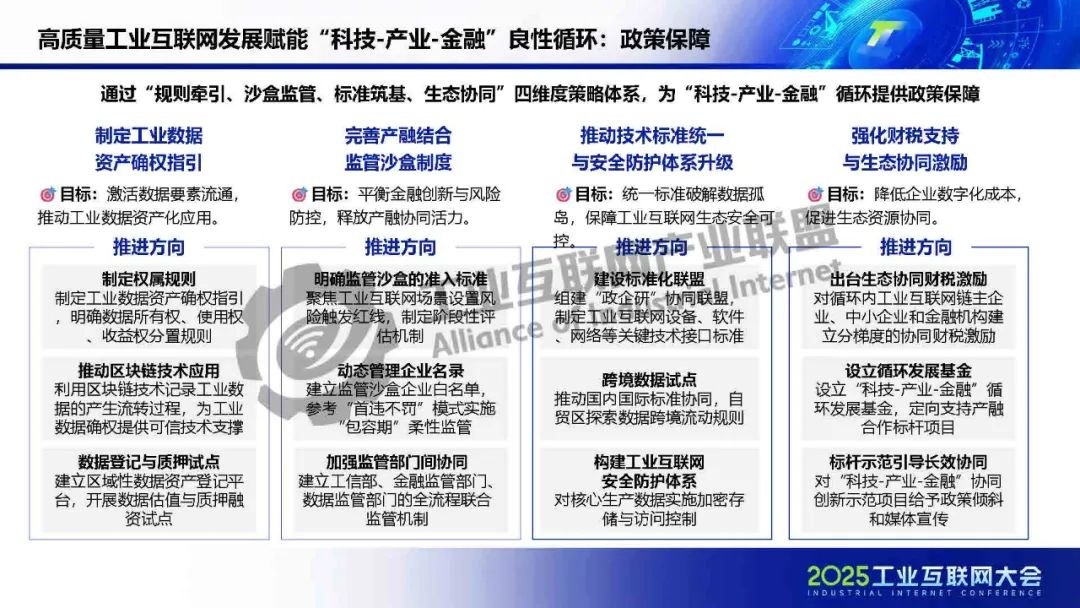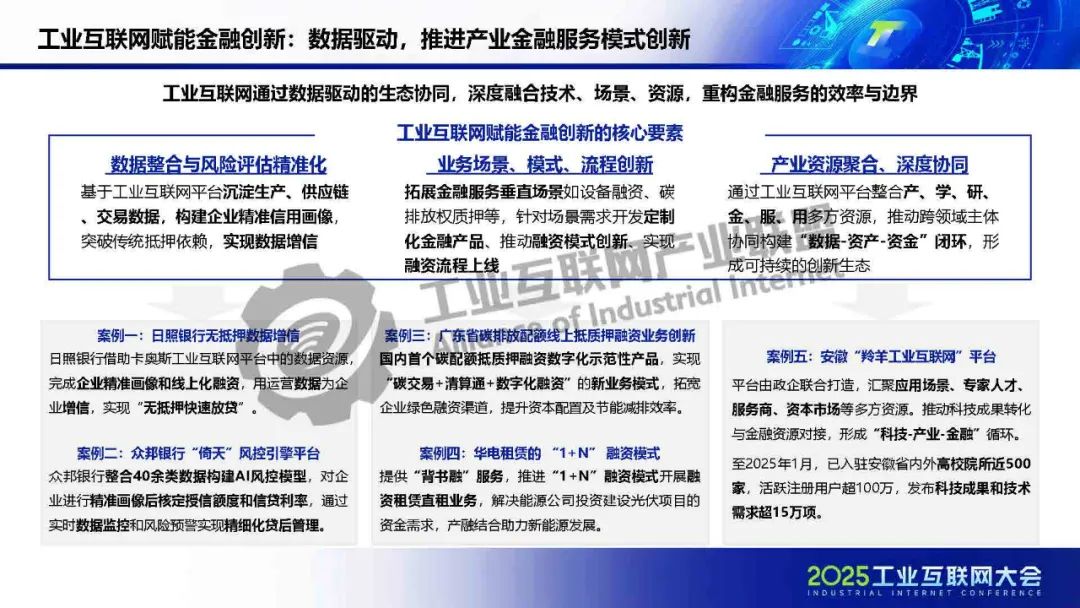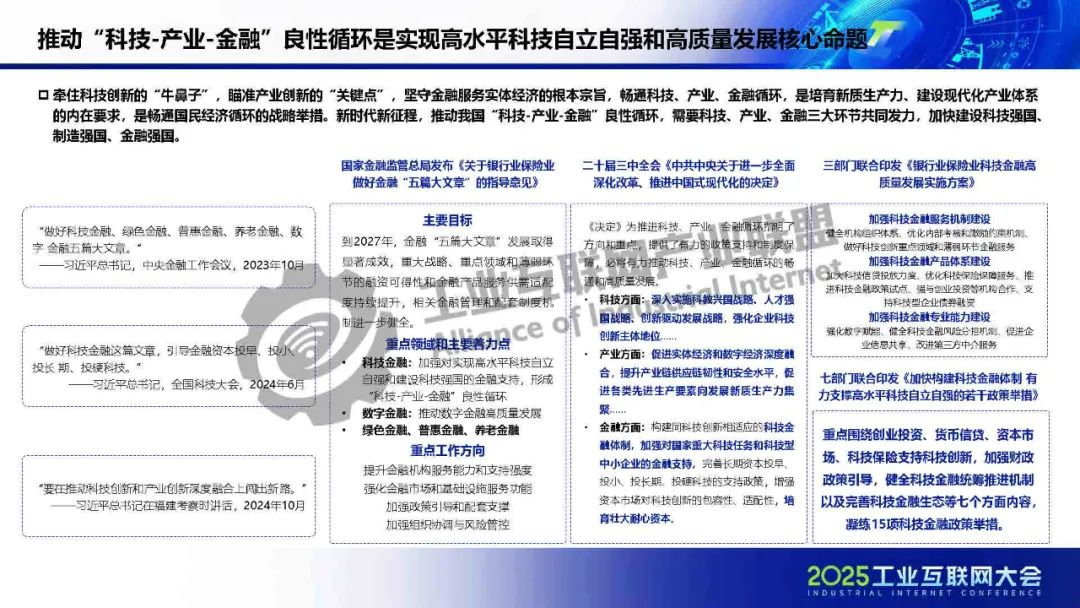 廖文凱介紹,我國工業互聯網由起步建設階段邁入高質量發展新階段,政策體系漸趨完善、技術融合應用持續深化、行業應用成效凸顯。而工業互聯網的高質量發展將進一步通過區域集群化協同與行業深度垂直化,打通科技、金融、產業的互動壁壘,構建“數據-資本-價值”三位一體的循環體系,推動實現“科技-金融-產業”良性循環。