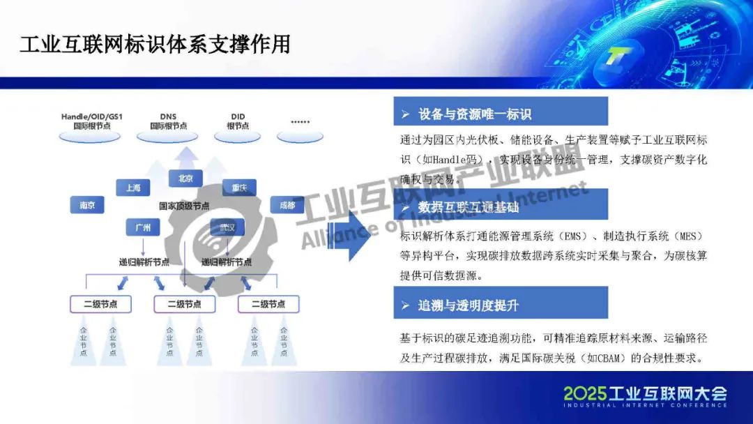 在園區(qū)建設(shè)方面,標(biāo)識(shí)體系作為工信部推動(dòng)全行業(yè)互聯(lián)互通的核心基礎(chǔ)設(shè)施,承擔(dān)著打破行業(yè)壁壘、賦能企業(yè)數(shù)字化升級(jí)的重要使命。一方面,依托標(biāo)識(shí)體系,可以為企業(yè)、產(chǎn)品和設(shè)備賦予統(tǒng)一、可信的數(shù)字身份,實(shí)現(xiàn)數(shù)據(jù)的精準(zhǔn)溯源與全流程管理,為能源效率提升和碳資產(chǎn)增值管理提供有力支撐,從而釋放園區(qū)運(yùn)營(yíng)成本優(yōu)化空間。另一方面,標(biāo)識(shí)體系有助于打通企業(yè)內(nèi)部及產(chǎn)業(yè)鏈上下游的信息壁壘,破解數(shù)據(jù)孤島,進(jìn)一步提升供應(yīng)鏈的低碳協(xié)同效率。