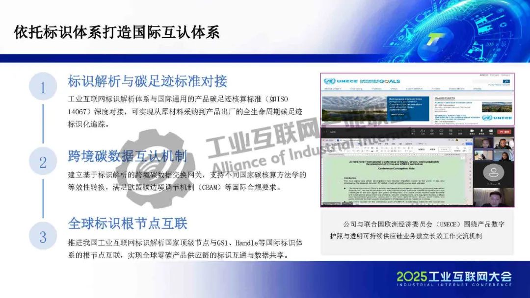 在國(guó)際互認(rèn)方面,依托標(biāo)識(shí)體系,可以構(gòu)建中國(guó)零碳園區(qū)國(guó)際認(rèn)證的高效互認(rèn)體系,增強(qiáng)我國(guó)在綠色貿(mào)易中的話(huà)語(yǔ)權(quán)。基于標(biāo)識(shí)解析的跨境碳數(shù)據(jù)交換網(wǎng)關(guān),能夠支持不同國(guó)家碳核算方法學(xué)的等效轉(zhuǎn)換,滿(mǎn)足歐盟碳邊境調(diào)節(jié)機(jī)制(CBAM)等國(guó)際合規(guī)要求,實(shí)現(xiàn)跨境碳數(shù)據(jù)的互認(rèn)。此外,工業(yè)互聯(lián)網(wǎng)標(biāo)識(shí)解析體系還與國(guó)際通用的產(chǎn)品碳足跡核算標(biāo)準(zhǔn)ISO14067深度對(duì)接,可實(shí)現(xiàn)產(chǎn)品從原材料采購(gòu)到出廠(chǎng)全生命周期碳足跡的標(biāo)識(shí)化追蹤。