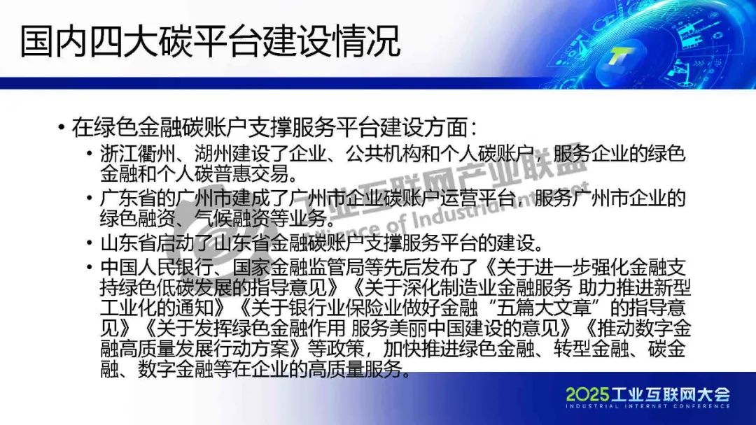 張崇見(jiàn)指出雙碳工作面臨的政策協(xié)調(diào)難、金融支持難、企業(yè)成本高、歐美貿(mào)易壓力四大難題,并介紹了國(guó)內(nèi)碳中和支撐、產(chǎn)品碳足跡、綠色產(chǎn)業(yè)鏈供應(yīng)鏈、綠色金融碳賬戶等四大碳平臺(tái)的建設(shè)進(jìn)展,提出分層分部門的碳中和支撐平臺(tái)、綠色產(chǎn)業(yè)鏈供應(yīng)鏈平臺(tái)、產(chǎn)品碳足跡平臺(tái)及綠色金融碳賬戶平臺(tái)的建設(shè)框架與功能。