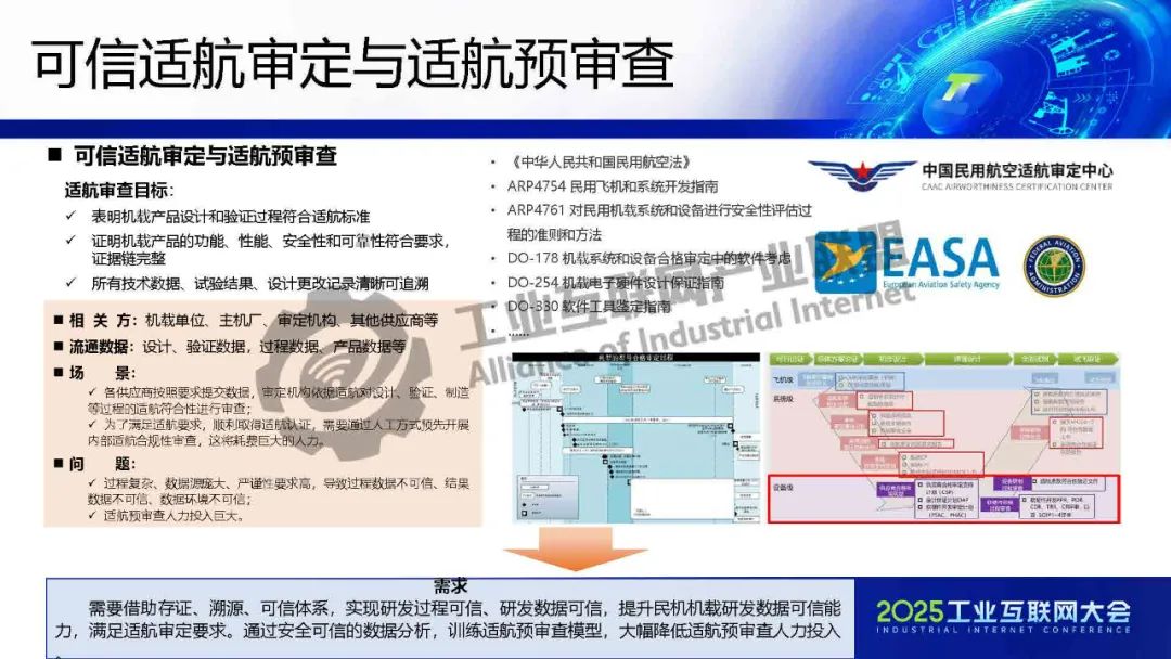 可信適航審定與適航預(yù)審查:需要借助存證、溯源、可信體系,實(shí)現(xiàn)研發(fā)過程可信、研發(fā)數(shù)據(jù)可信,提升民機(jī)機(jī)載研發(fā)數(shù)據(jù)可信能力,滿足適航審定要求。通過安全可信的數(shù)據(jù)分析,訓(xùn)練適航預(yù)審查模型,大幅降低適航預(yù)審查人力投入。