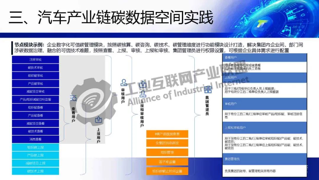企業數字化可信碳管理模塊,按照碳核算、碳咨詢、碳技術、碳管理維度進行功能模塊設計打造,解決集團內企業間、部門間涉碳數據治理、融合的可信技術難題,按照查看、上報、審核、上報和審核、集團管理員進行權限設置,可根據企業具體需求進行配置。