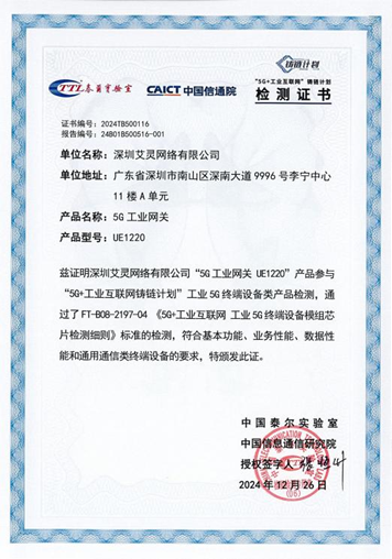 近日,深圳艾靈網(wǎng)絡(luò)有限公司自主研發(fā)的UE1220工業(yè)5G網(wǎng)關(guān)順利通過第一批“5G+工業(yè)互聯(lián)網(wǎng)”鑄鏈計劃產(chǎn)品測試,測試內(nèi)容涵蓋5G NR基本功能、業(yè)務(wù)性能、數(shù)據(jù)性能和通信類終端功能等方面。