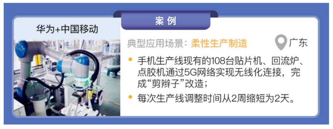 華為與中國移動(dòng)合作,在廣東省松山湖工廠利 8 用 5G 技術(shù)實(shí)現(xiàn)了柔性生產(chǎn)制造場景的應(yīng)用。華為松山湖工廠原有手機(jī)生產(chǎn)車間需要布線9 萬米,每條生產(chǎn)線平均擁有186 臺設(shè)備,生產(chǎn)線每半年隨新手機(jī)機(jī)型的更新需要進(jìn)行升級和調(diào)整,物料變更、工序增減等要求車間所有網(wǎng)線的重新布放,每次調(diào)整需要停工 2 周,以每28 秒一部手機(jī)計(jì)算,一天停工影響產(chǎn)值達(dá) 1000 多萬。通過5G 與工業(yè)互聯(lián)網(wǎng)的融合應(yīng)用,華為松山湖工廠把生產(chǎn)線現(xiàn)有的108 臺貼片機(jī)、回流爐、點(diǎn)膠機(jī)通過 5G 網(wǎng)絡(luò)實(shí)現(xiàn)無線化連接,完成“剪辮子”改造,每次生產(chǎn)線調(diào)整時(shí)間從2 周縮短為2 天。同時(shí),在手機(jī)組裝過程中的點(diǎn)隔熱膠、打螺釘、手機(jī)貼膜、打包封箱等工位部署視覺檢測相機(jī),通過5G 網(wǎng)絡(luò)連接,把圖片或視頻發(fā)送到部署在 MEC 上的(人工智能)AI 模塊中進(jìn)行訓(xùn)練,一方面多線共享樣本后縮短了模型訓(xùn)練周期,另一方面實(shí)現(xiàn)了從“多步一檢”到“一步一檢”模式改變,及時(shí)發(fā)現(xiàn)產(chǎn)品質(zhì)量問題。
