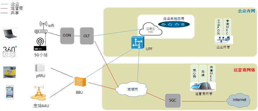 工廠內(nèi)網(wǎng)絡可以細分為企業(yè)內(nèi)網(wǎng)和運營商網(wǎng)絡。企業(yè)內(nèi)網(wǎng)可以部署下沉UPF+MEC,起到業(yè)務分流、降低時延、數(shù)據(jù)不出廠的作用。辦公類數(shù)據(jù)可以經(jīng)城域網(wǎng)進入運營商外網(wǎng)。企業(yè)內(nèi)的5G無線部署可以多種方式相結(jié)合,包括宏站、皮站、室分、一體化小基站等。對于運營商外網(wǎng),需要考慮如何把小基站的數(shù)據(jù)經(jīng)由PON回傳后分流至5GC。對于宏站,也可以考慮采用工業(yè)PON作為回傳,只用于BBU下沉工廠內(nèi)的情況,BBU如果放在電信機房,則無需通過工業(yè)PON回傳。對于企業(yè)內(nèi)網(wǎng),根據(jù)企業(yè)業(yè)務的不同,可能需要部署MEC,將部分WiFi、5G小基站、宏站的流量分流到工廠內(nèi)部。