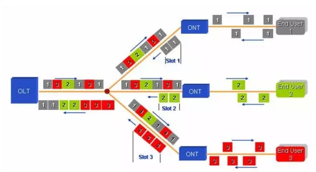 工業(yè)PON系統(tǒng)由局端OLT(光線路終端)、用戶端ONU(光網(wǎng)絡單元)、及連接局端和用戶端設備的ODN(光分配網(wǎng)絡)組成。整個系統(tǒng)采用單纖雙向、點到多點的網(wǎng)絡結(jié)構(gòu)。下行方向(OLT到ONU),OLT發(fā)送的信號通過ODN到達各個ONU;上行方向(ONU到OLT),ONU發(fā)送的信號會到達OLT,但不會到達其他ONU。為了避免數(shù)據(jù)沖突并提高網(wǎng)絡利用效率,上行方向采用時分多址接入(TDMA)方式并對各ONU的數(shù)據(jù)發(fā)送進行調(diào)度。ODN由光纖和一個或者多個無源光分路器等無源光器件組成,在OLT和ONU之間提供光通道。