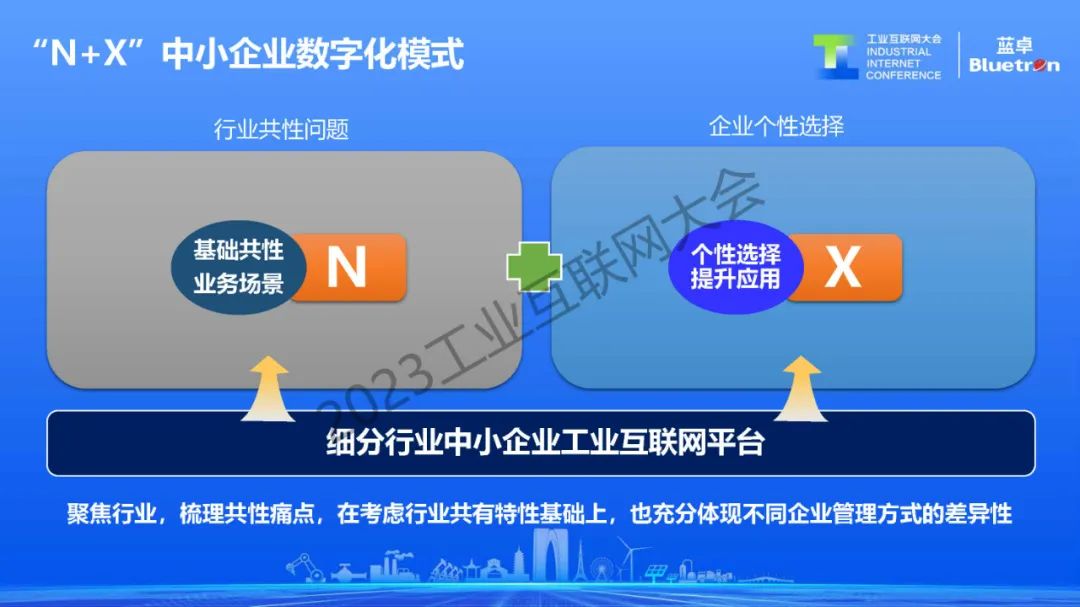 而中小企業用工業互聯網實現數字化轉型是完全另外一個邏輯。因為中小企業通常是缺資金、缺人員、缺技術,處于一種不敢轉、不愿轉、不會轉和轉不起的狀態。而藍卓在過去幾年用工業操作系統賦能中小企業數字化進行實踐,逐漸形成了1+1+N+X模式。
