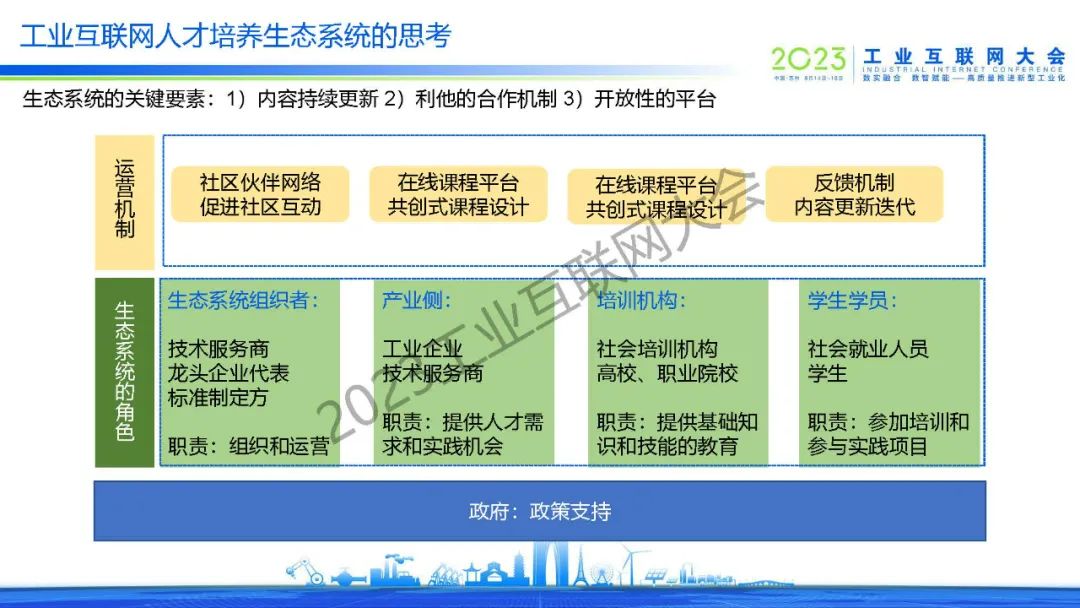 “工業(yè)互聯(lián)網(wǎng)人才培養(yǎng)生態(tài)系統(tǒng)的關鍵要素:1)內(nèi)容持續(xù)更新2)利他的合作機制3)開放性的平臺。”