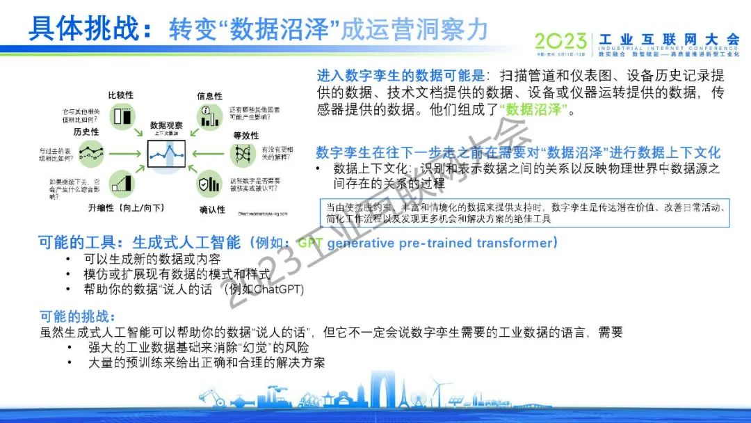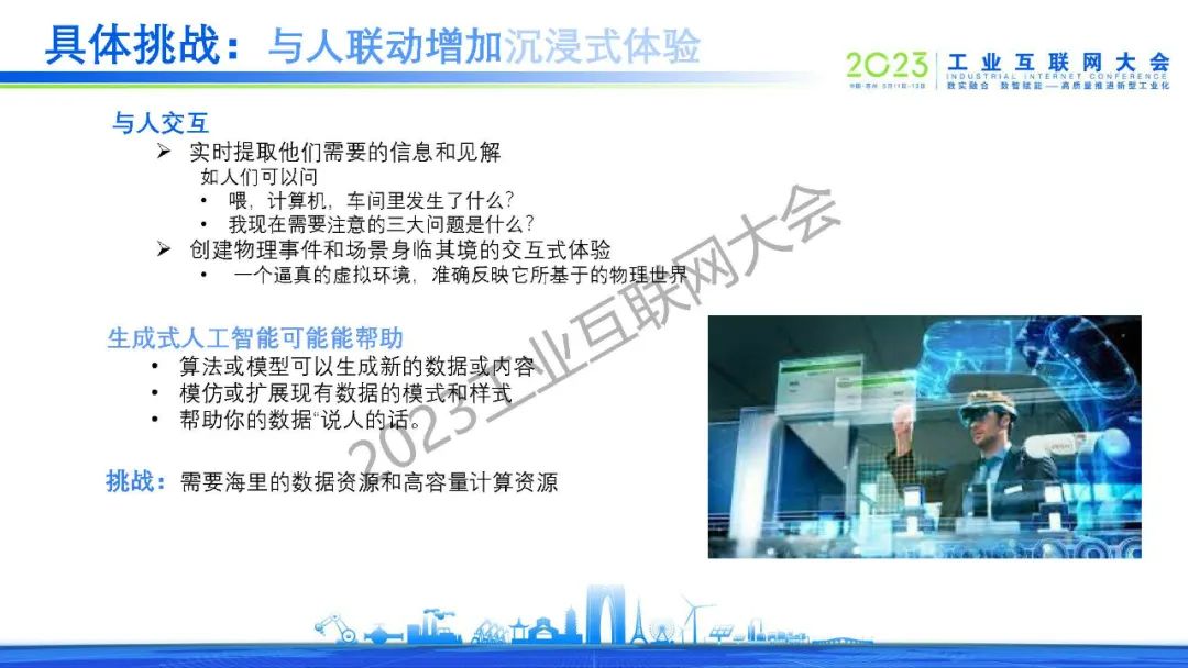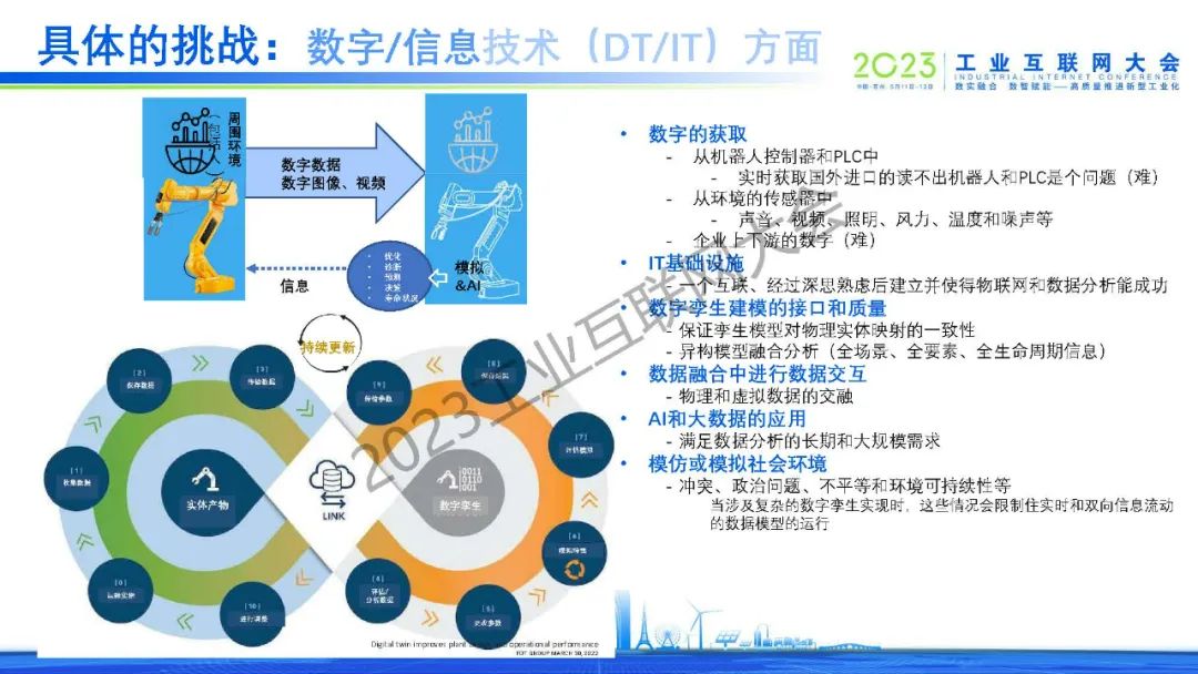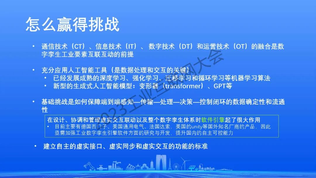 沈八中表示通信技術(shù)、信息技術(shù)、 數(shù)字技術(shù)(數(shù)據(jù)可視化技術(shù))和運(yùn)營(yíng)技術(shù)的融合是數(shù)字孿生工業(yè)要素互聯(lián)互動(dòng)的前提。人工智能工具是數(shù)字孿生中數(shù)據(jù)處理和交互的關(guān)鍵。當(dāng)今人工智能除了已經(jīng)發(fā)展成熟的深度學(xué)習(xí)、強(qiáng)化學(xué)習(xí)、遷移學(xué)習(xí)和循環(huán)學(xué)習(xí)等機(jī)器學(xué)習(xí)算法外,新型的以全概率和大型模型為基礎(chǔ)的生成式人工智能將起到?jīng)Q定性的作用。為讓全國(guó)乃至全球數(shù)字孿生技術(shù)的共同發(fā)展,我們應(yīng)考慮建立自主的虛實(shí)接口、虛實(shí)同步和虛實(shí)交互的功能的標(biāo)準(zhǔn)。