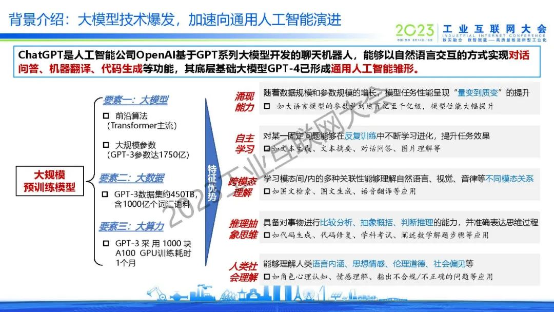 王海萍介紹,ChatGPT是人工智能公司OpenAI基于GPT系列大模型開發的聊天機器人,能夠以自然語言交互的方式實現對話問答、機器翻譯、代碼生成等功能,其底層基礎大模型GPT-4已形成通用人工智能雛形。目前,我國工業大模型面臨數據、產業、技術的三大挑戰,需要從頂層設計到落地實踐,引導“需求側”和“供給側”兩端發力,加速工業大模型規范有序發展。