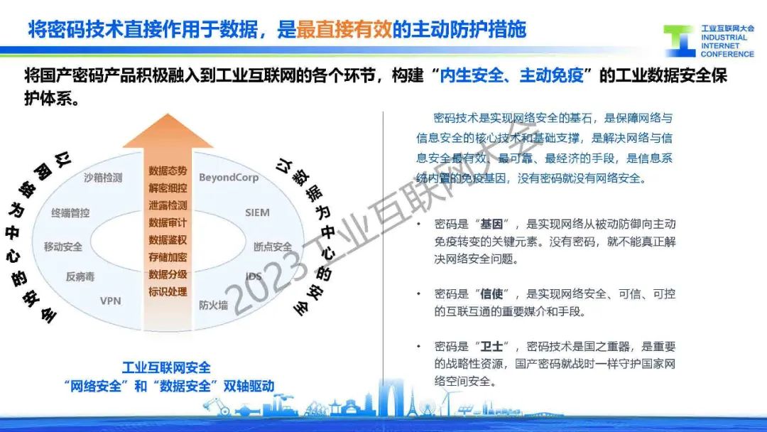 王平表示,隨著工業(yè)聯(lián)網(wǎng)設(shè)備大規(guī)模增長(zhǎng),一方面網(wǎng)絡(luò)邊界越來(lái)越不清晰,另一方面網(wǎng)絡(luò)信息系統(tǒng)不可避免存在安全缺陷。傳統(tǒng)的被動(dòng)防御式的網(wǎng)絡(luò)安全防護(hù)手段無(wú)法真正解決數(shù)據(jù)安全問(wèn)題。他指出,將密碼技術(shù)直接作用于數(shù)據(jù),是最直接有效的主動(dòng)防護(hù)措施,將國(guó)產(chǎn)密碼產(chǎn)品積極融入到工業(yè)互聯(lián)網(wǎng)的各個(gè)環(huán)節(jié),構(gòu)建“內(nèi)生安全、主動(dòng)免疫”的工業(yè)數(shù)據(jù)安全保護(hù)體系。
