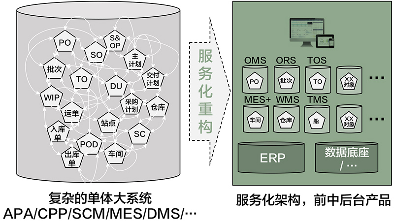 傳統(tǒng)的供應(yīng)鏈IT系統(tǒng)是煙囪式的,隨著業(yè)務(wù)增長(zhǎng)、需求變化加快,會(huì)出現(xiàn)用戶體驗(yàn)差、重復(fù)建設(shè)、響應(yīng)周期長(zhǎng)等問(wèn)題,不能適應(yīng)業(yè)務(wù)發(fā)展的需要。通過(guò)對(duì)復(fù)雜的單體大系統(tǒng)進(jìn)行服務(wù)化改造,讓服務(wù)化子系統(tǒng)融合業(yè)務(wù)要素、應(yīng)用要素和數(shù)據(jù)要素,可以實(shí)現(xiàn)業(yè)務(wù)、數(shù)據(jù)與系統(tǒng)功能的銜接(如圖2)。