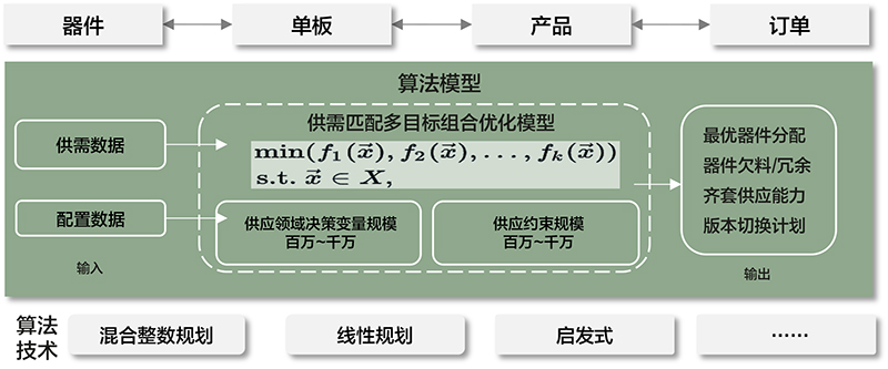 比如,在資源準(zhǔn)備的場(chǎng)景中,華為供應(yīng)鏈面臨著千萬(wàn)級(jí)數(shù)據(jù)規(guī)模,億級(jí)計(jì)算規(guī)模的復(fù)雜業(yè)務(wù)場(chǎng)景。但是華為基于線性規(guī)劃、混合整數(shù)規(guī)劃、啟發(fā)式算法等求解方法的組合,構(gòu)建了從器件、單板到產(chǎn)品、訂單之間的雙向模擬引擎(如圖3)。在錯(cuò)綜復(fù)雜的產(chǎn)品結(jié)構(gòu)樹(shù)和供應(yīng)網(wǎng)絡(luò)節(jié)點(diǎn)中,快速找到資源準(zhǔn)備的最優(yōu)解,在供應(yīng)能力最大化的同時(shí)實(shí)現(xiàn)存貨可控。