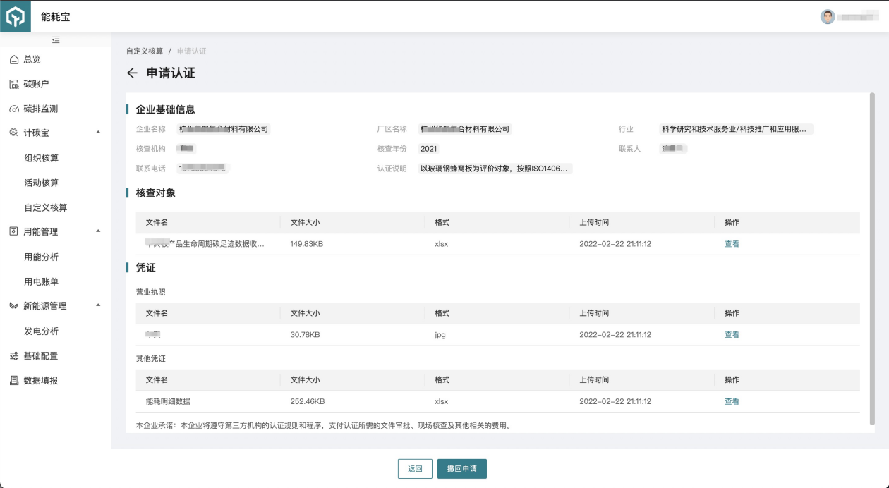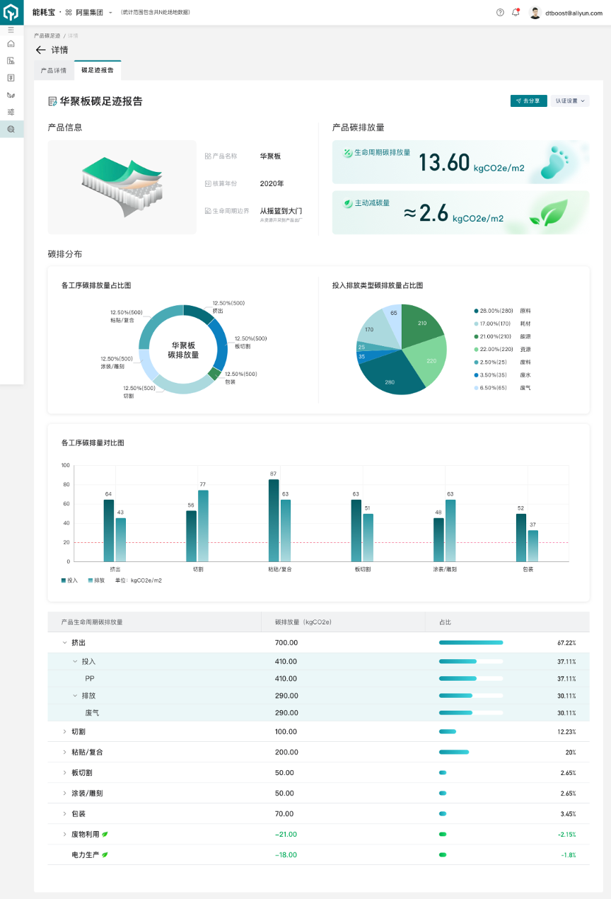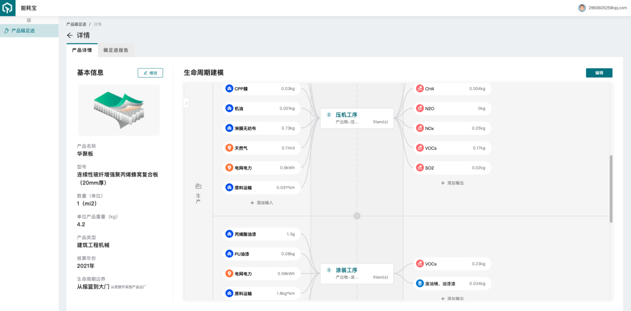 基于碳足跡建模和核算結果,進一步,通過在線認證工具鏈接的第三方認證公司,完成產品碳足跡的在線認證。最后通過能耗寶進行報告、證書和標簽的生成。
