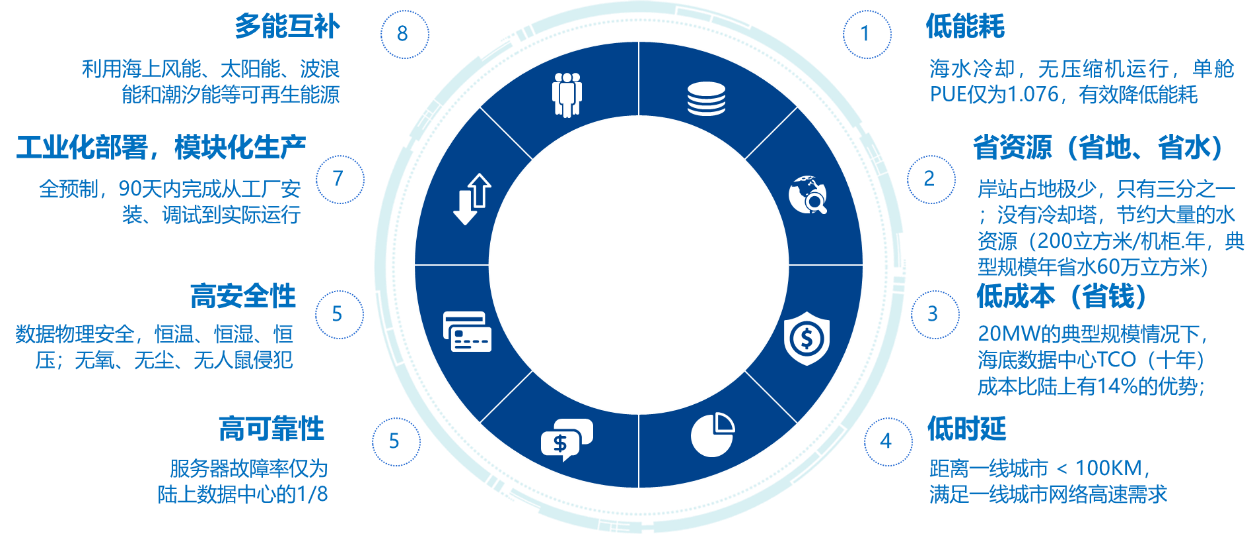 依靠海水自然冷源、無氧、無塵、模塊化部署等條件,海底數(shù)據(jù)中心在能耗、土地、水資源、故障率、交付周期等方面較陸地數(shù)據(jù)中心有著獨特的優(yōu)勢。根據(jù)清華大學(xué)傳熱與能源利用北京重點實驗室出具的能效測試報告,海底數(shù)據(jù)中心的單艙PUE值為1.076。這一指標(biāo)保證了海底數(shù)據(jù)中心節(jié)能降耗,在其生命周期內(nèi)具備比陸地數(shù)據(jù)中心更好的經(jīng)濟(jì)優(yōu)勢。由于海底數(shù)據(jù)中心散熱不需要消耗水,運營過程中每年每個機柜可以節(jié)約200立方米的水資源。海底數(shù)據(jù)中心通過工程預(yù)制實現(xiàn)了快速部署,建設(shè)由“工地”遷移到“工廠”,具備了工業(yè)化的本質(zhì),可實現(xiàn)一體化交付,規(guī)模化運維。我國東部地區(qū)具有臨海的區(qū)位優(yōu)勢,集聚了全國超過45%的人口和近60%的GDP。對于上海、深圳這一類沿海超大城市,海底數(shù)據(jù)中心的價值特點尤為突出。
