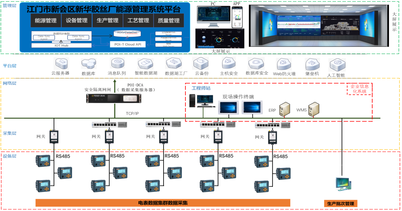 面向場景:打造了一套新華膠絲廠能耗在線監(jiān)測管理系統(tǒng)平臺,具備與ERP等上層信息系統(tǒng),以及一期項目的工廠數(shù)字化制造運營系統(tǒng)、現(xiàn)場儀器儀表、設(shè)備的集成能力,并將這些實時數(shù)據(jù)存入本地MySQL數(shù)據(jù)庫,為未來企業(yè)發(fā)展新系統(tǒng)的集成,打下穩(wěn)定、擴展性的基礎(chǔ)。
