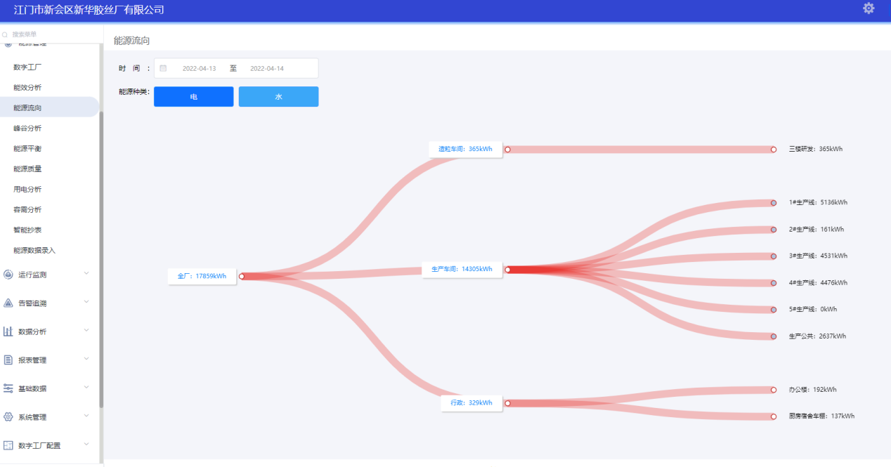 新華膠絲廠生產(chǎn)能源流向動態(tài)監(jiān)測(全廠→生產(chǎn)車間→生產(chǎn)線→重點耗能設(shè)備等);通過能源流向圖,可以查看能源消耗的去向,也可以查看不同區(qū)域能源利用比例情況。該能流圖能夠?qū)崟r顯示生產(chǎn)過程中不同能源的消耗數(shù)據(jù)。