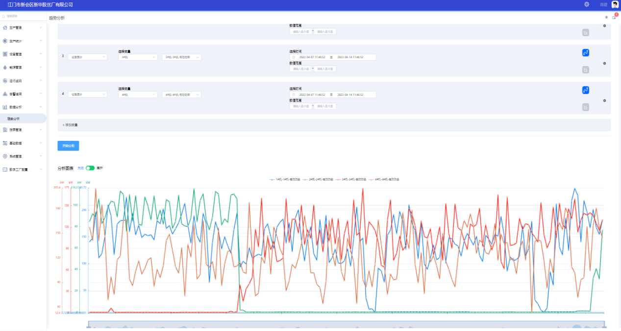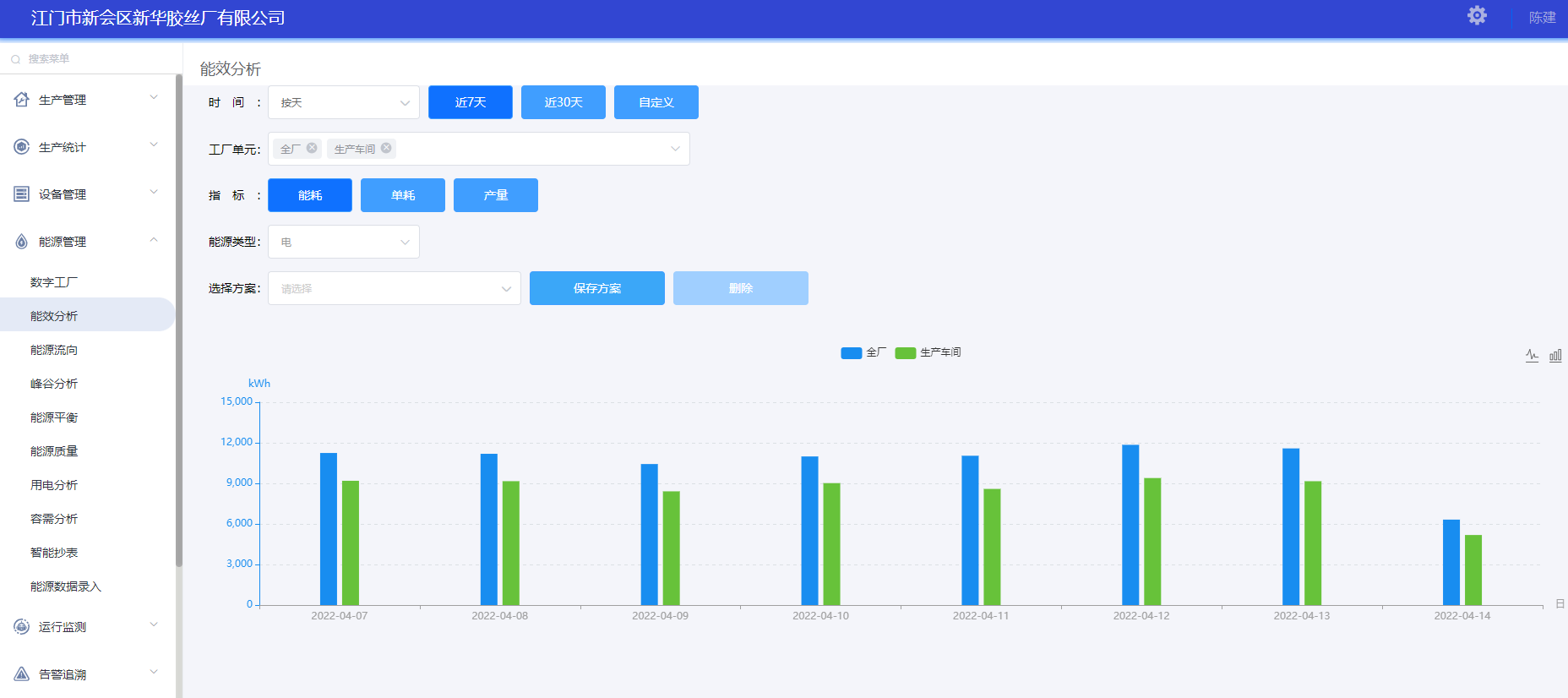 新華膠絲廠能效分析具有強大的歷史能耗數(shù)據(jù)追溯和分析功能,多維度分析企業(yè)不同生產(chǎn)區(qū)域/設(shè)備的能耗、能效水平及產(chǎn)量,可隨時查看某個區(qū)域/設(shè)備、時間、班組的能耗、能效、產(chǎn)量波動情況,通過動態(tài)的圖形顯示,快速了解是否有異常情況,從而對生產(chǎn)、管理、工藝及時進(jìn)行指導(dǎo)和調(diào)整,使新華膠絲廠生產(chǎn)過程的單位能耗和能源效率保持在科學(xué)、合理水平。